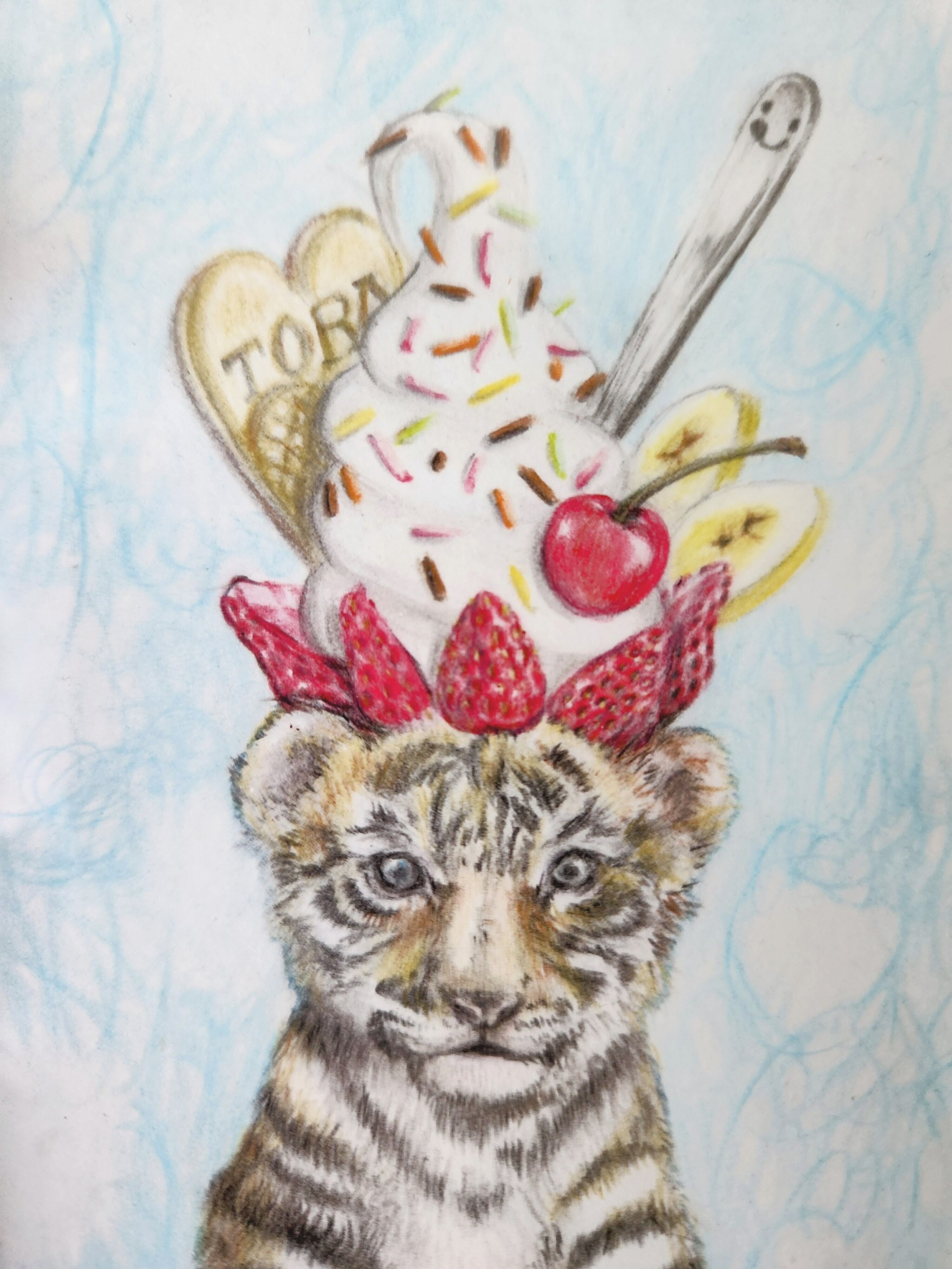 仔トラのやわらかい毛並みとパフェというミスマッチな絵です。